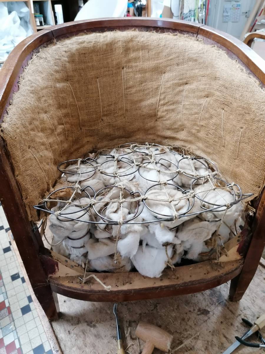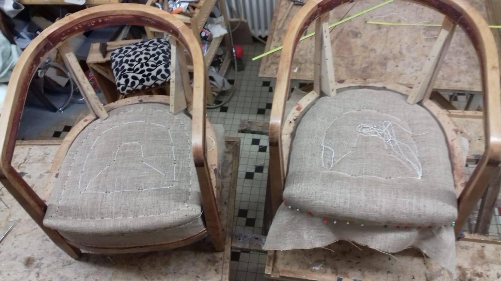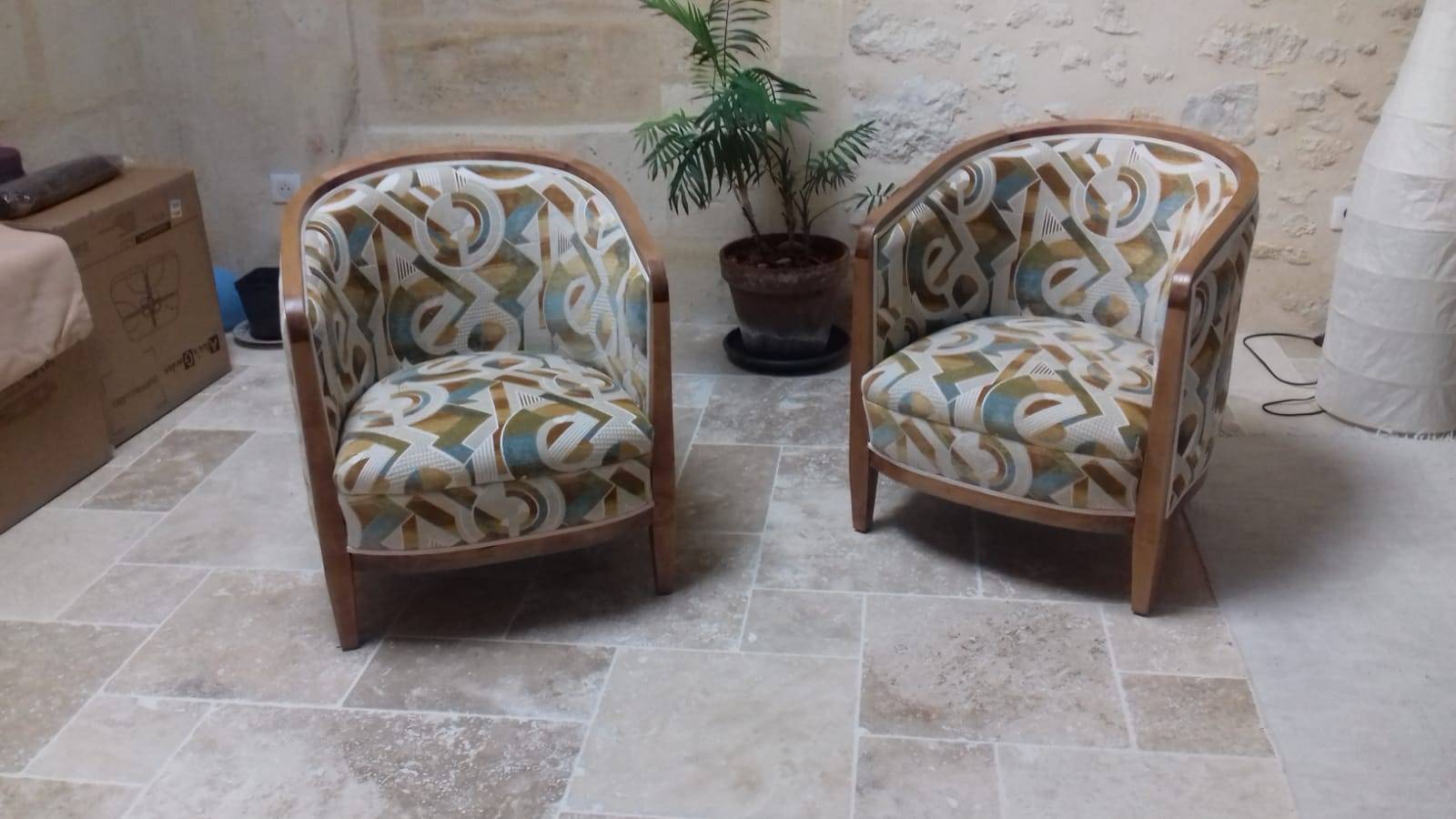 Réfection d'une paire de fauteuil tonneaux datant de 1950. Garnissage traditionnel sur une assise suspendue. Couverture avec un tissu motifs Art Déco pour rester dans le style de l'époque.