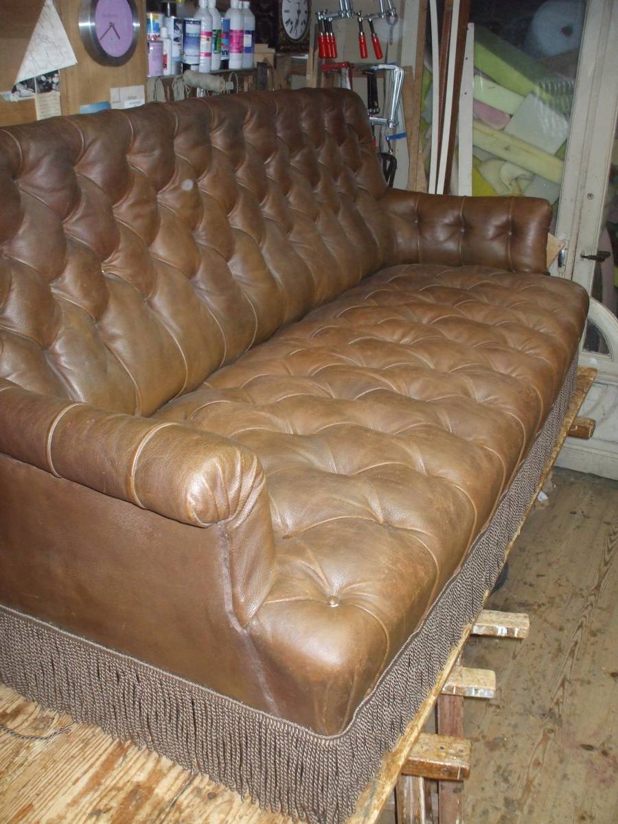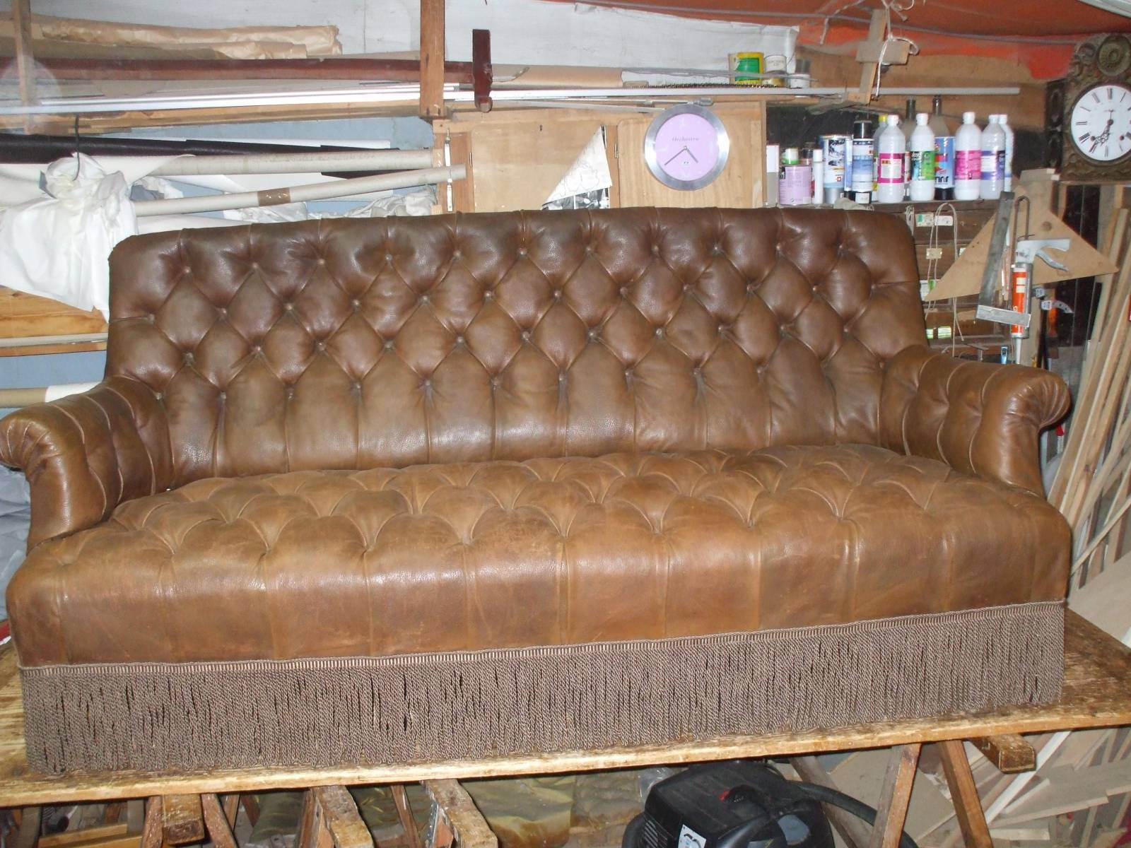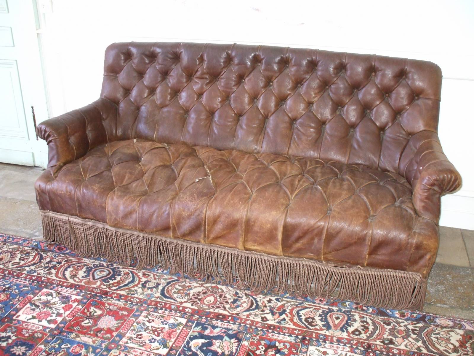Nous avons réalisé une restauration de la garniture traditionnelle de ce canapé capitonné tout en conservant le cuir d'origine avec une passementerie nouvelle (frange).